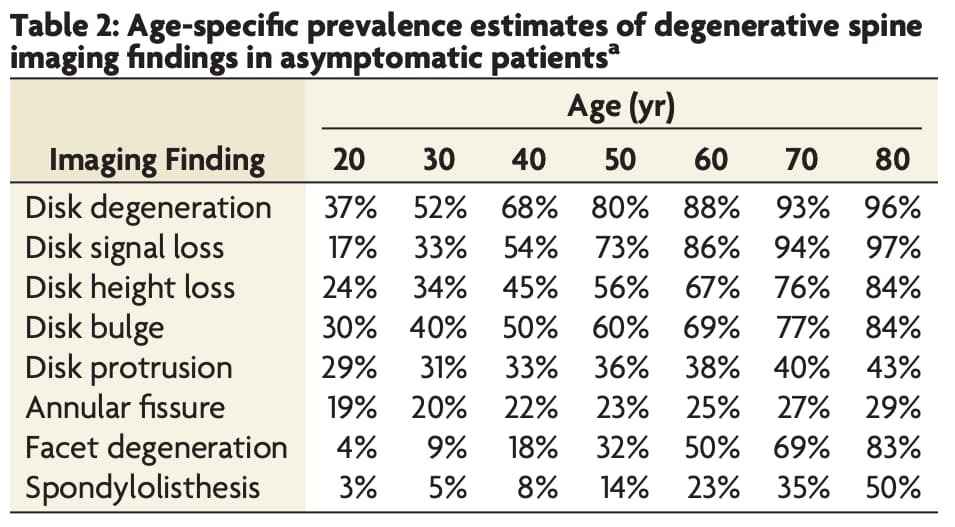 Brinjikji and colleagues did a huge (and rather famous at this point) study on asymptomatic (PAIN-FREE) people. [3]