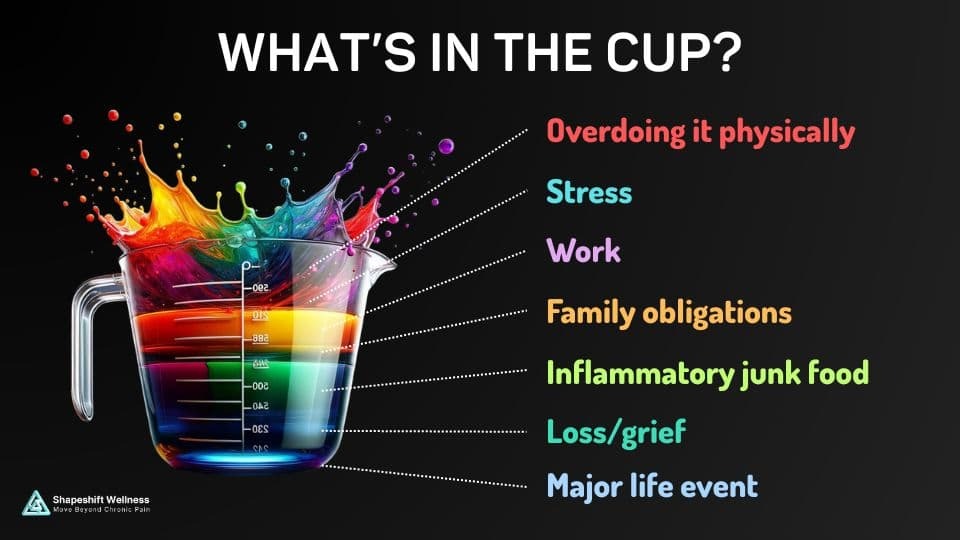 - This week I’ve noticed more tightness in the hip and groin and I’m not sure if that’s a “No Worse” issue and I should back off exercises?” (Answer: We gather more information about “what’s in the cup?” to see if there are non-physical factors like stress, sleep, and life situations that are impacting pain, and we may or may not need to change exercises, and/or focus on lifestyle changes)